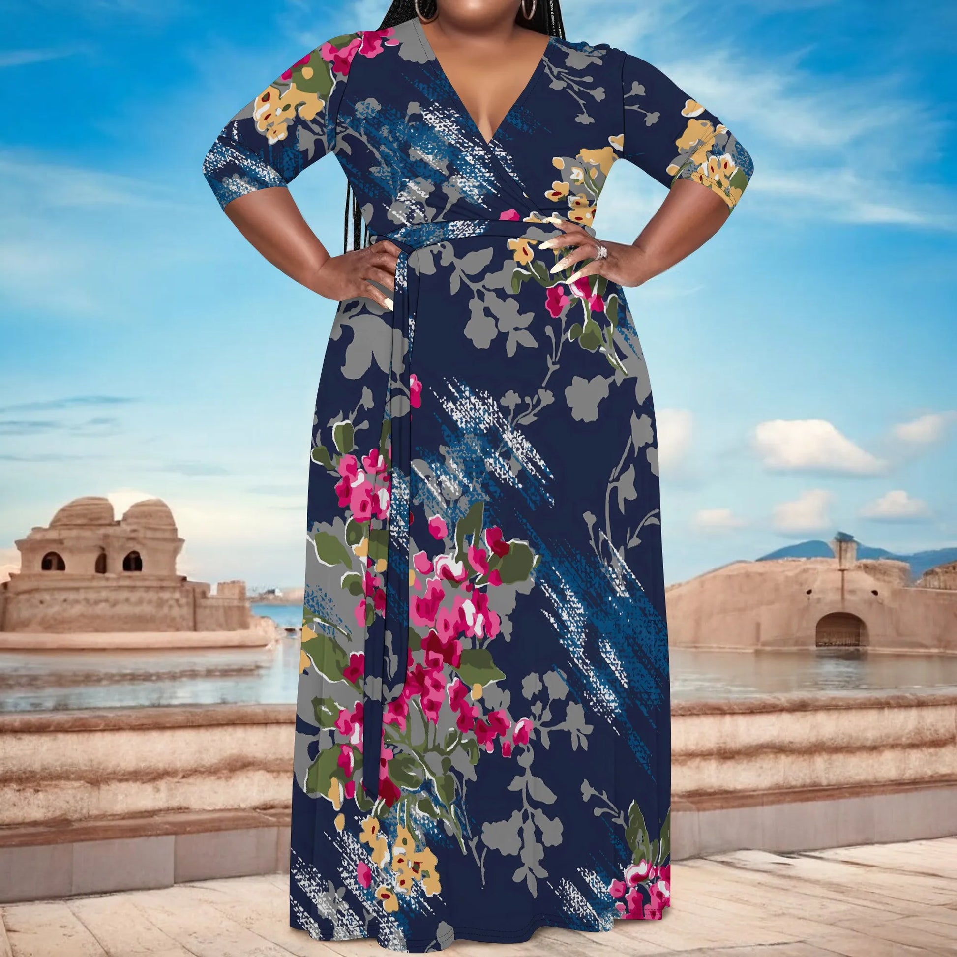 Robe longue à fleurs abstraites à col en V et manches mi-longues pour femme, grande taille, élégante, idéale pour les vacances d'été